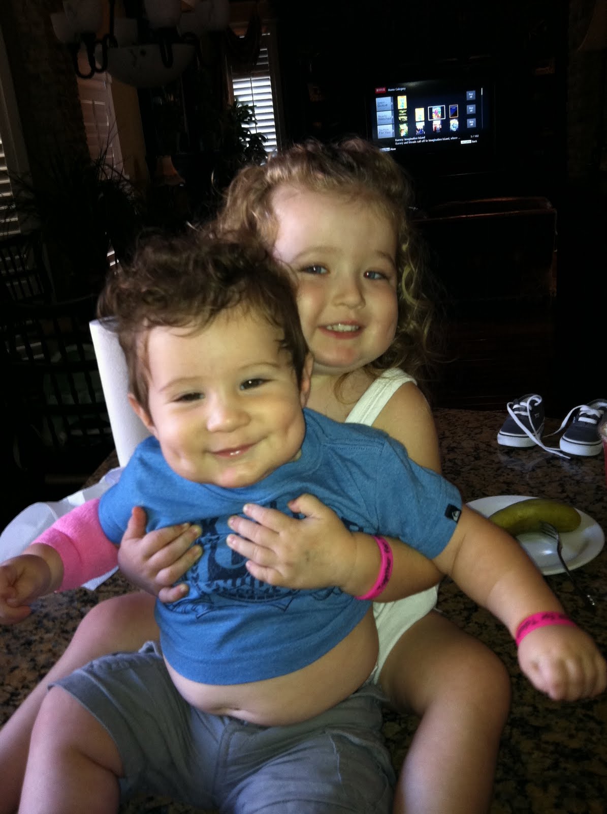 She has been wanting to hold him. He is almost as big as her. They are both chunky and I love it. Her cheeks and double chin are hilarious. LOVE IT! Pretty much to get a picture of them both smiling. Too cute though.